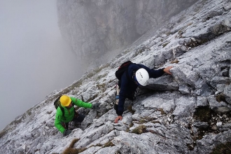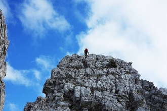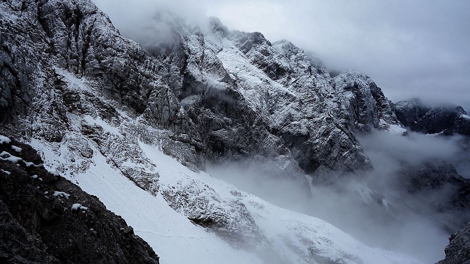 Mrzla Gora (Cold Mountain) (2203 m), a summit of the central group, to the North of the Kamnik-Savinja Alps range is a remarkable mountain and paradise for true rock climbers. Mrzla gora still has the reputation of being a difficultly accessible mountain. The path along the west ridge is secured, but only scarcely in the summital part. No room for mistakes. We managed to the top. Then, we went for Rinkas – four summits related by a circling ridge above a crater-like basin, walls and ridges dropping in all directions. The plan was to reach Kranjska Rinka (2453 m), the highest of the four, along a reasonably demanding marked and mostly secured path. Eastern wall was nothing but pure pleasure. However, when we reached the north face conditions changed. Fresh, unstable snow, getting deeper as we climbed further. Once we reached an exposed, inclined, smooth and unsecured rock covered with 20 cm of fresh snow, we knew we had to give up and turn back, having no winter equipment. See you next time, Rinkas:)